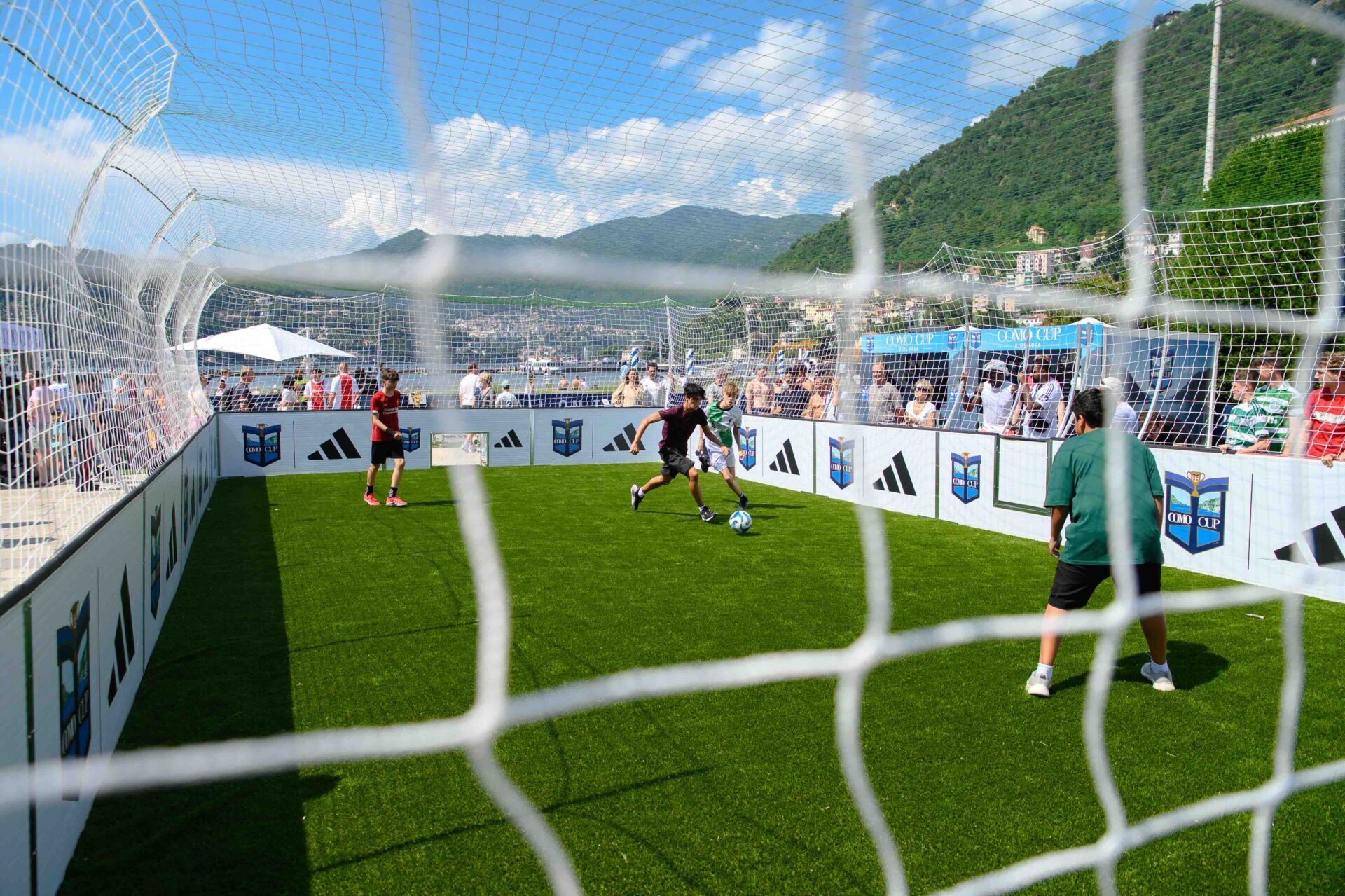 The village also doubled as a showroom for the club and its partners. Adidas energy ran through the week from the new home strip to the already celebrated sneaker project that nods to lake colours and artisan detail. Como and adidas had announced their multi year partnership for 2024/25 and beyond so the festival was a natural moment to let the collaboration live in public. The limited edition sneaker series that began last autumn was upgraded with a hand painted lake motif and collector aura. Fans queued for photos and products while children lined up for the next three versus three. It is football merch reframed as lifestyle and travel memento.